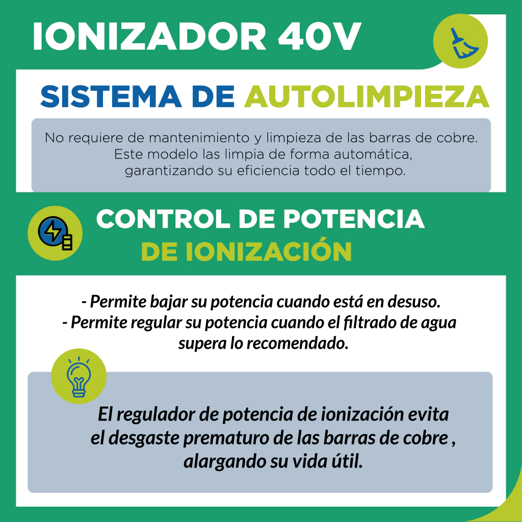 La ionización es un sistema de tratamiento de aguas donde un electrodo de cobre y otros minerales libera iones que se disuelven en el agua haciéndola biológicamente inocua y resistente a la formación de algas y microorganismos. No alteran el nivel de pH, por lo que el agua se mantiene muy estable. Permanecen por períodos muy extensos de tiempo. No se evaporan aún en condiciones extremas y de calor intenso, por lo que son ideales para piscinas templadas.