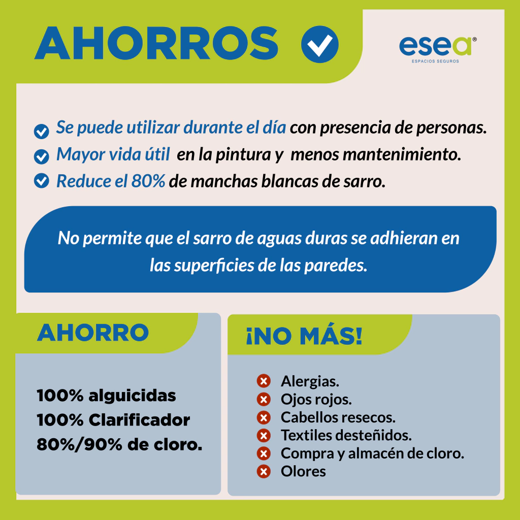 Disfruta del agua cristalina y segura, sin los riesgos y costos que trae el uso intensivo de productos químicos.